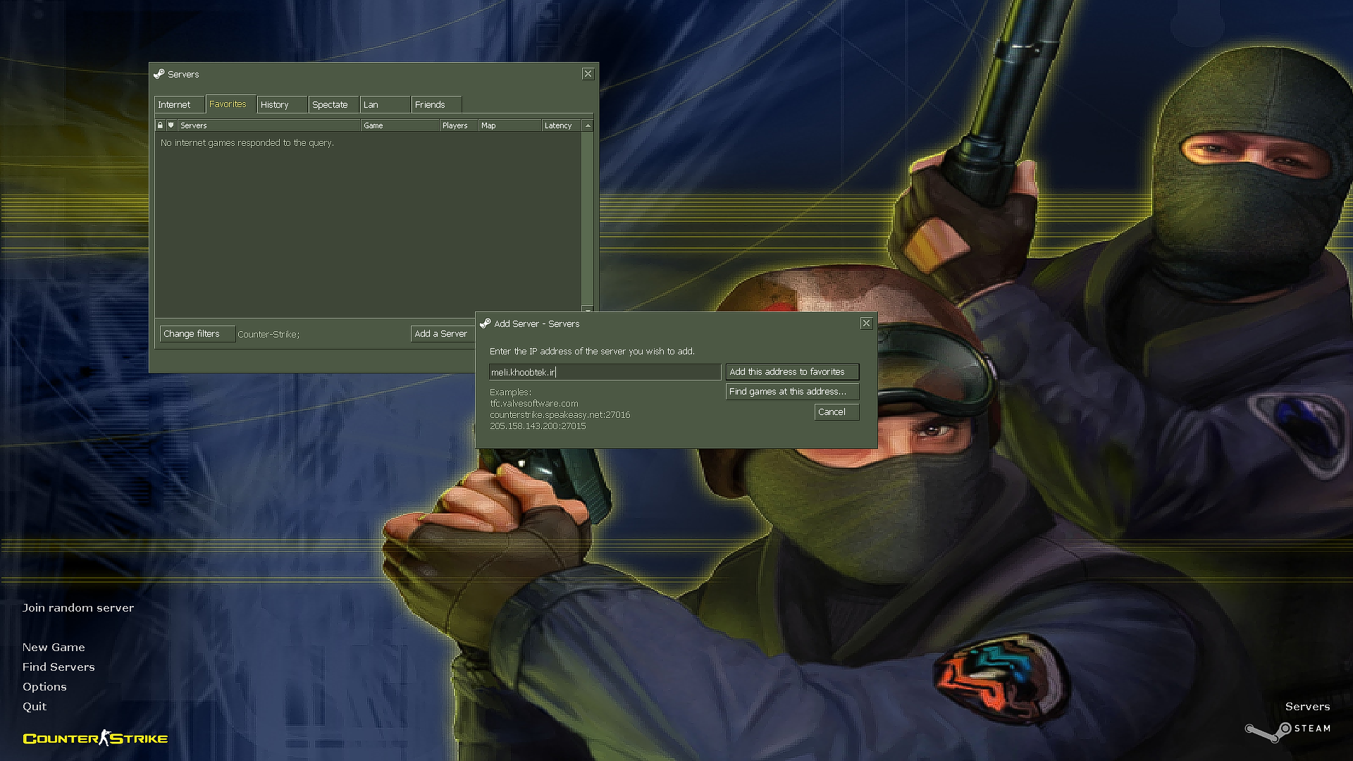 برای بازی کردن Counter-Strike 1.6 به همراه دوستان خود در سرور خوب تک میتوانید آدرس زیر را به عنوان آدرس سرور در پنجره Add Server وارد کرده و به لیست سرور های خود اضافه کنید.